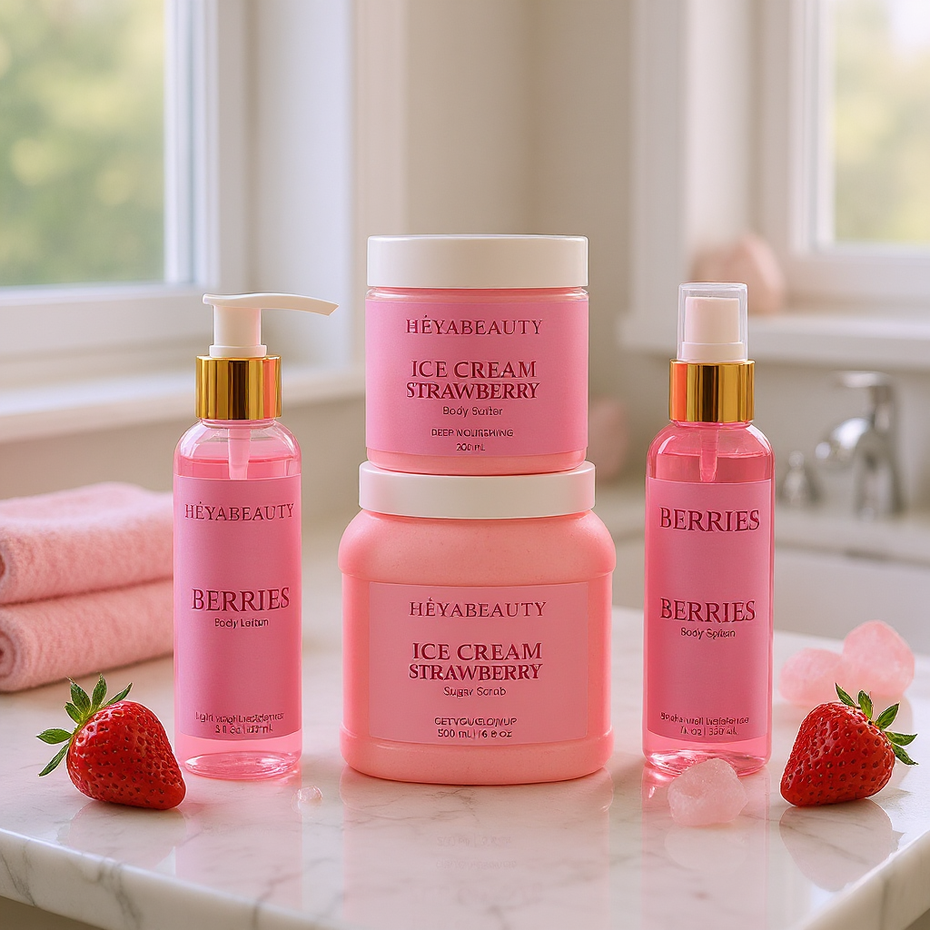 Answer 2: The Ice Cream Strawberry Body Butter provides deep hydration and leaves a sweet scent, the Sugar Scrub gently exfoliates for smooth skin, the lightweight Berries Body Lotion offers fast absorption without greasiness, and the Berries Body Splash refreshes and hydrates with a lovely fragrance.